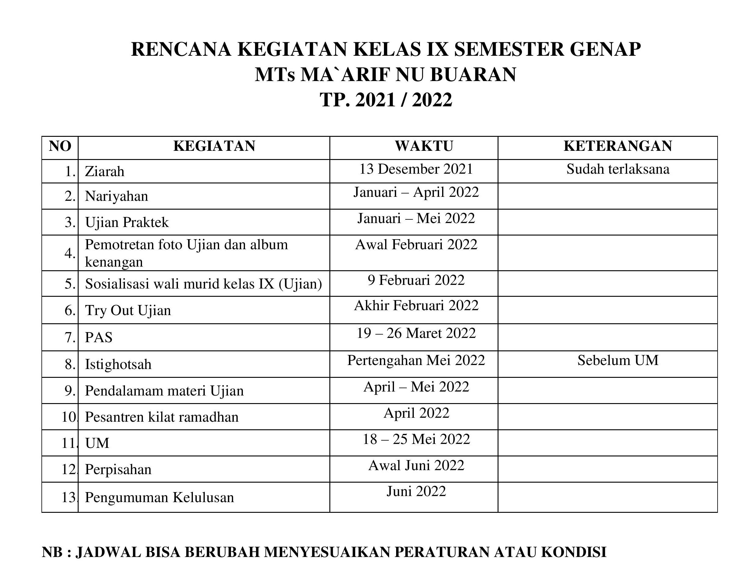 Adapun agenda Kegiatan Akhir Kelas IX tahun 2022 sebagai berikut :
